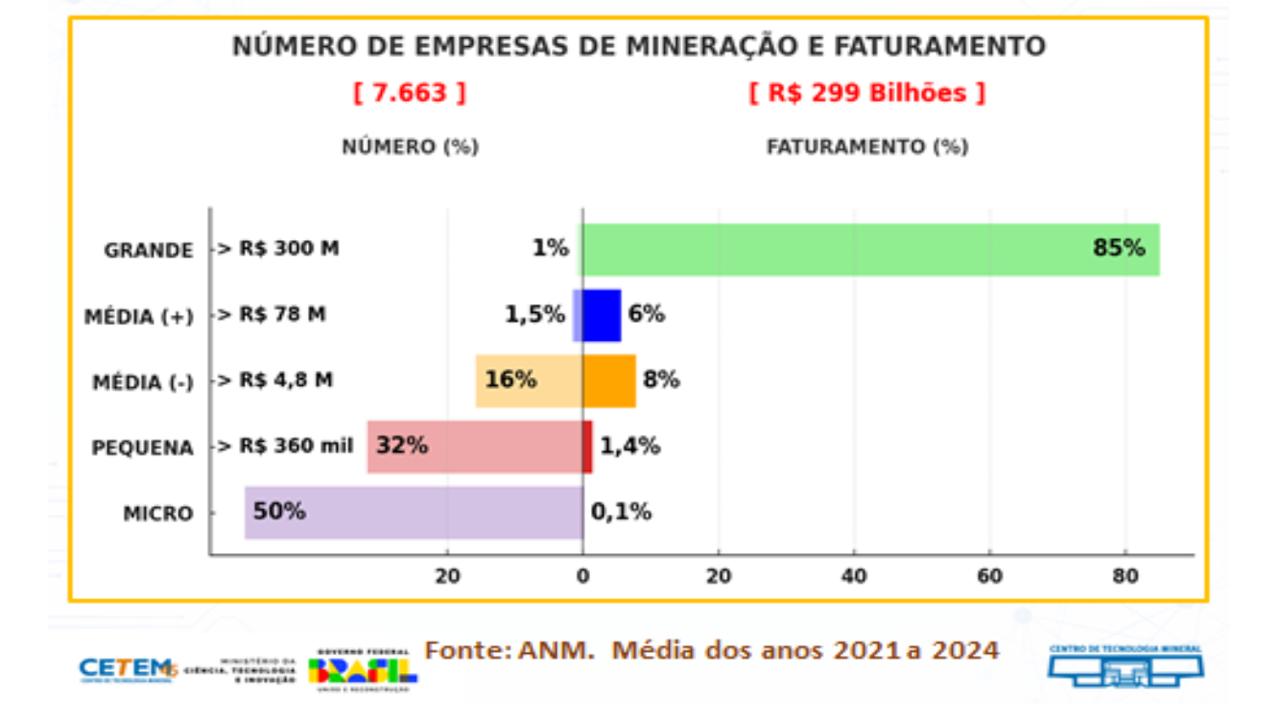 As 7.600+ empresas apresentaram faturamento de aproximadamente R$ 300 bilhões ao ano, na média do período 2021-2024. O faturamento da mineradora é a base para o cálculo de recolhimento do royalty, segundo a Lei 13.540 de 2017 que trata da CFEM. A receita bruta total é assim uma proxy do Valor da Produção Mineral (VPM). Usando o critério do BNDES de classificação da receita bruta, verifica-se que: